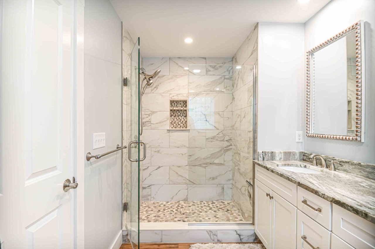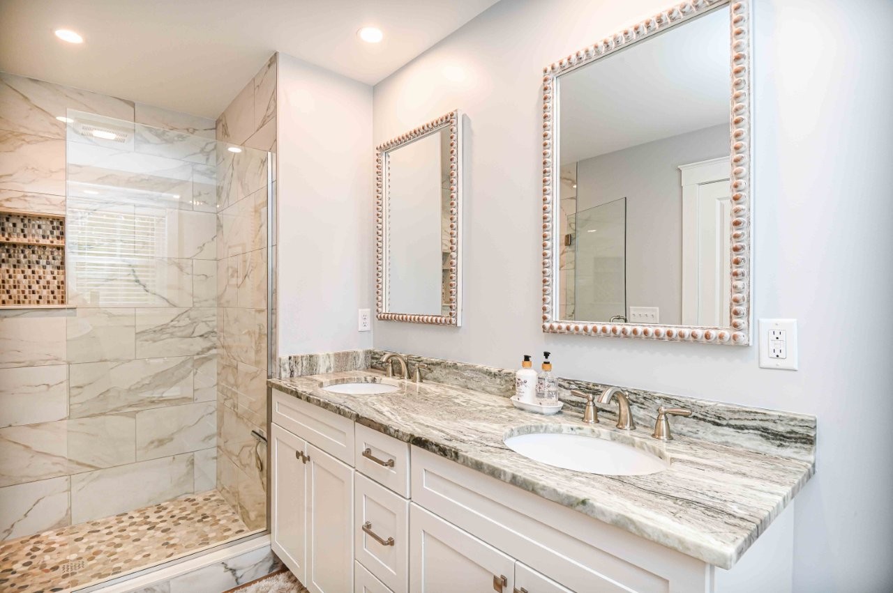 - Lovely primary bedroom suite including a custom walk-in tile shower, double sinks and a walk-in closet